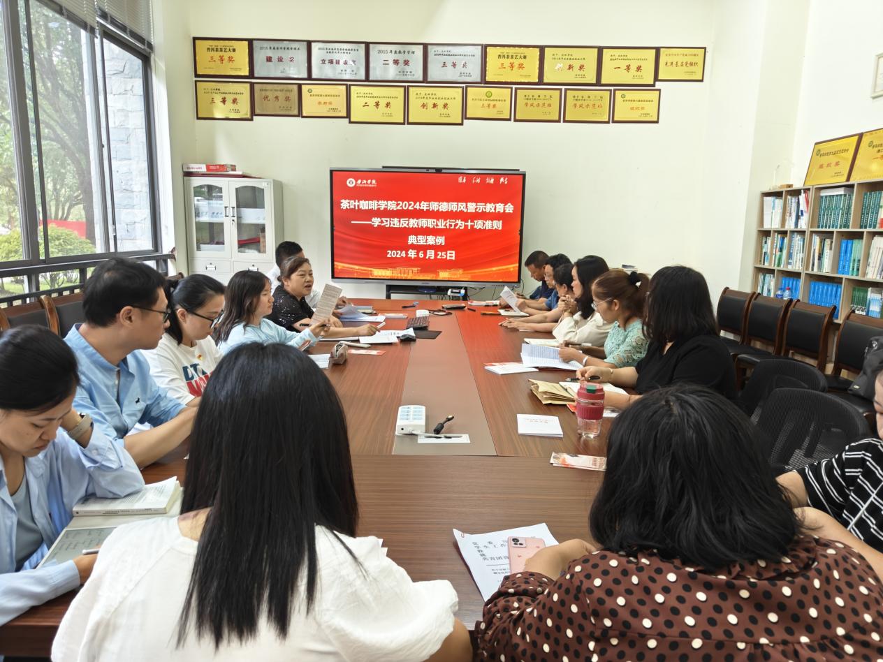 为引导学院教师自律自强,强化对师德失范不可为、不能为、不愿为的认同和遵守,形成自觉践行良好师德、维护良好师风学风的有利环境。根据学校《关于开展学习违反教师职业行为十项准则典型案例的通知》要求,6月25日,学院召开师德师风警示教育会,组织学院全体教职员工专题学习违反教师职业行为十项准则典型案例,学院党总支书记李秀主持会议。
