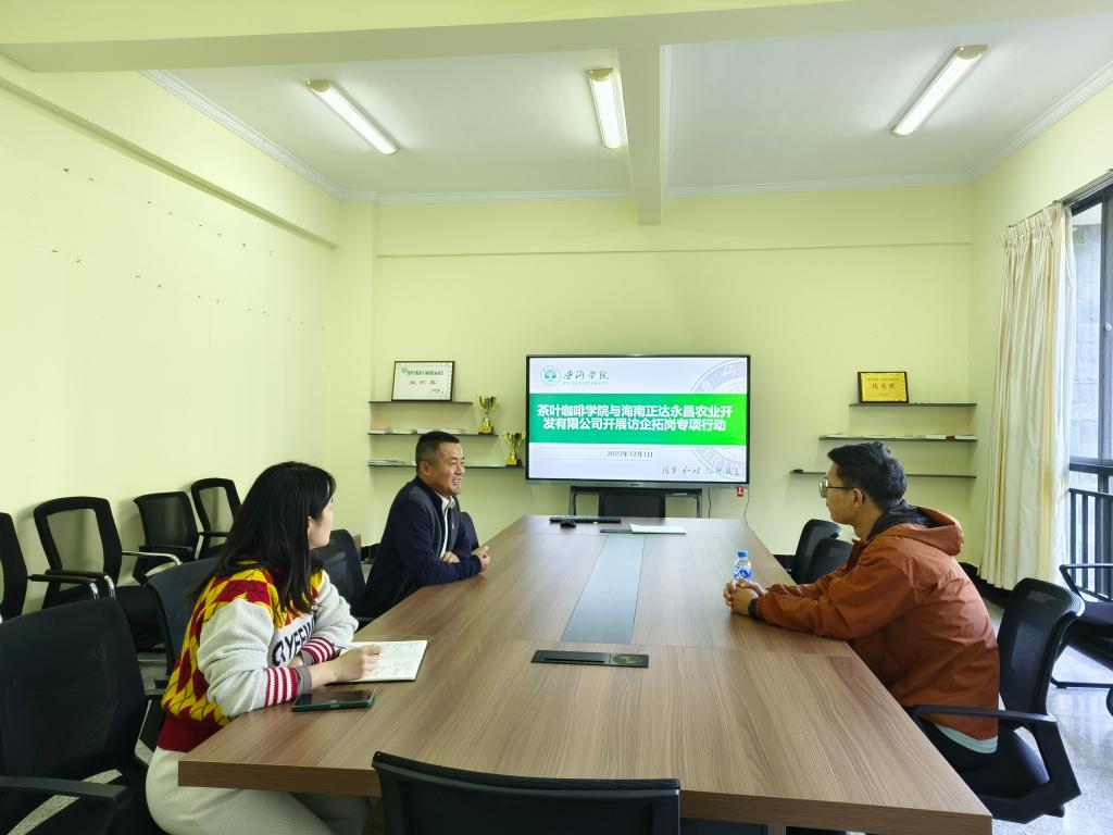 为助力2024届毕业生充分就业,茶叶咖啡学院开展访企拓岗促就业专项行动,通过“请进来”与“走出去”相结合拓展毕业生就业岗位。12月1日,茶叶咖啡学院邀请海南正达永昌农业开发有限公司代表到校进行交流座谈。学院党总支副书记、院长赵锋参加了此次座谈。