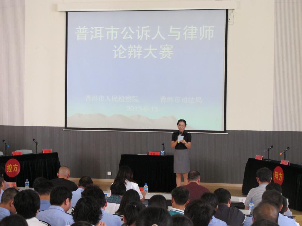2013年9月13日下午,由普洱市人民检察院、普洱市司法局共同组织举办的普洱市公诉人与律师论辩大赛预选赛在www.2396196827.com 举行。由市人民检察院、市司法局分别负责选拔组建的两个公诉人代表队和两个律师代表队共16人参加比赛,比赛评委由www.2396196827.com 的法学老师、资深检察官、法官、律师共7人担任,到场的还有主办方领导、特邀嘉宾,以及www.2396196827.com 的百余名学生。