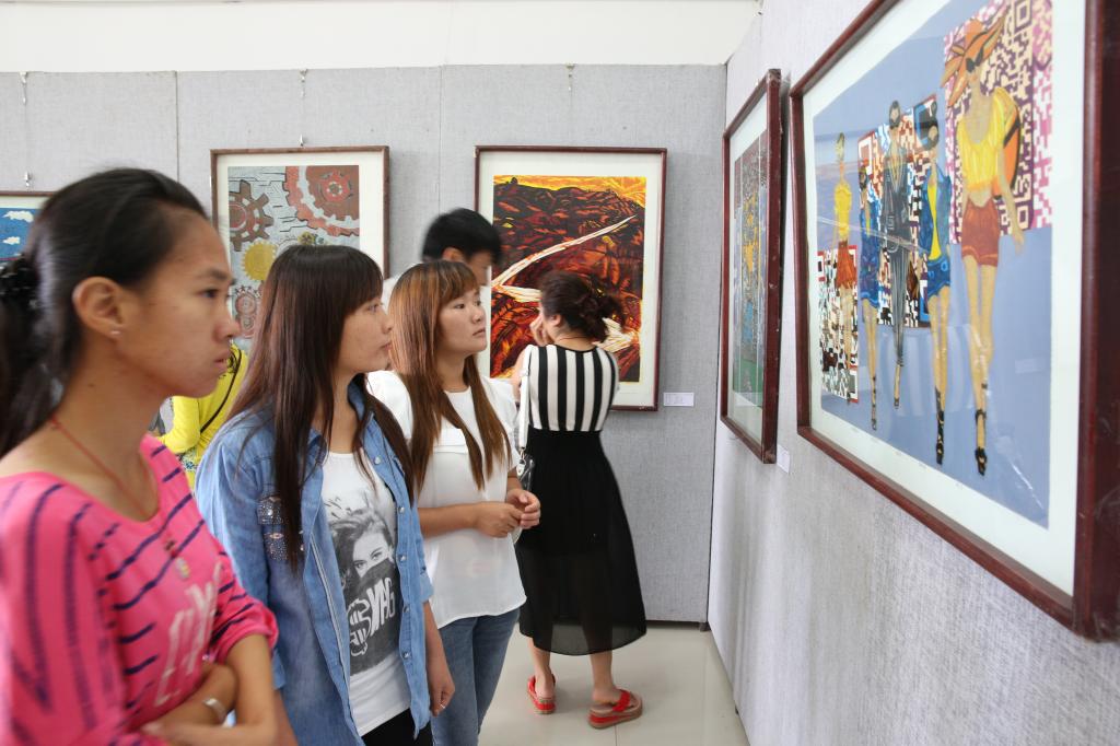 6月9日,我校艺术学院2011级美教十一、设计六班毕业生作品展在图书馆举行开展仪式,校长成文章、艺术学院院领导及艺术学院师生出席了开展仪式。此次展览共展出作品87幅,其中版画65幅,油画18幅,国画4幅。展出的作品形式结构多样,幅式表现不拘一格,创作主题丰富多彩,展现出学生们新颖的创意和扎实的创作功底。