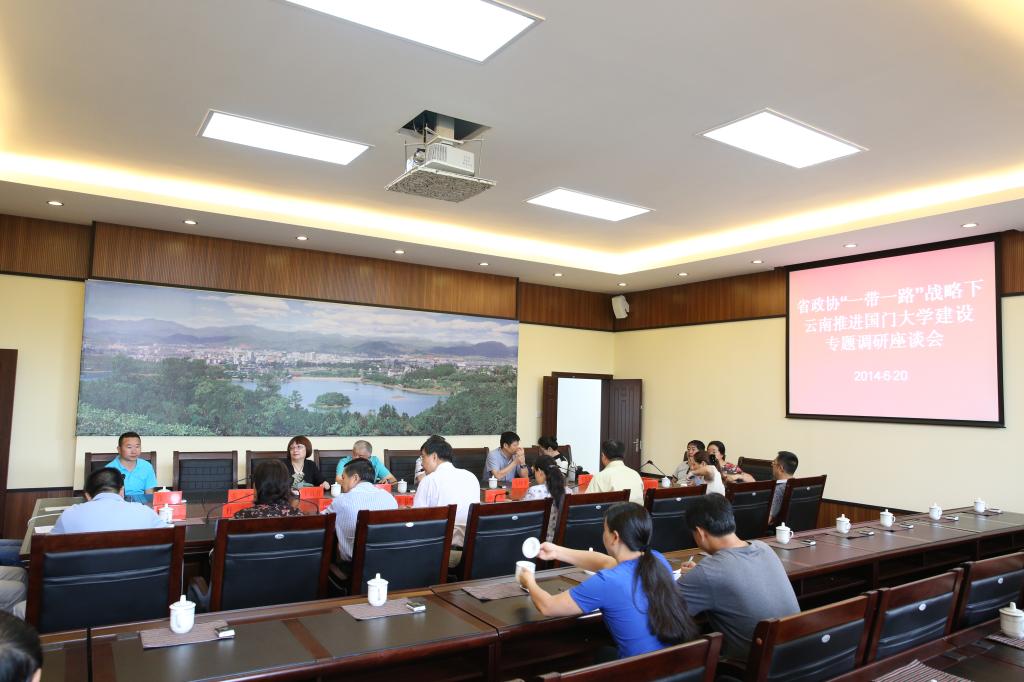 2014年6月20日上午,省政协“一带一路”倡议下推进国门大学建设专题调研座谈会在我校行政楼一楼会议室举行。省政协常委、省政协教科文卫体委员会主任严建,省政协教科文卫体委员会副主任彭兵、马林奎、王云月,省政协教科文卫体委员会特聘专家、省教育科学研究院院长、研究院、博导李慧勤;普洱市政府副市长童书纬、学校领导参加会议。会议由市政协副主席张丽菊主持。