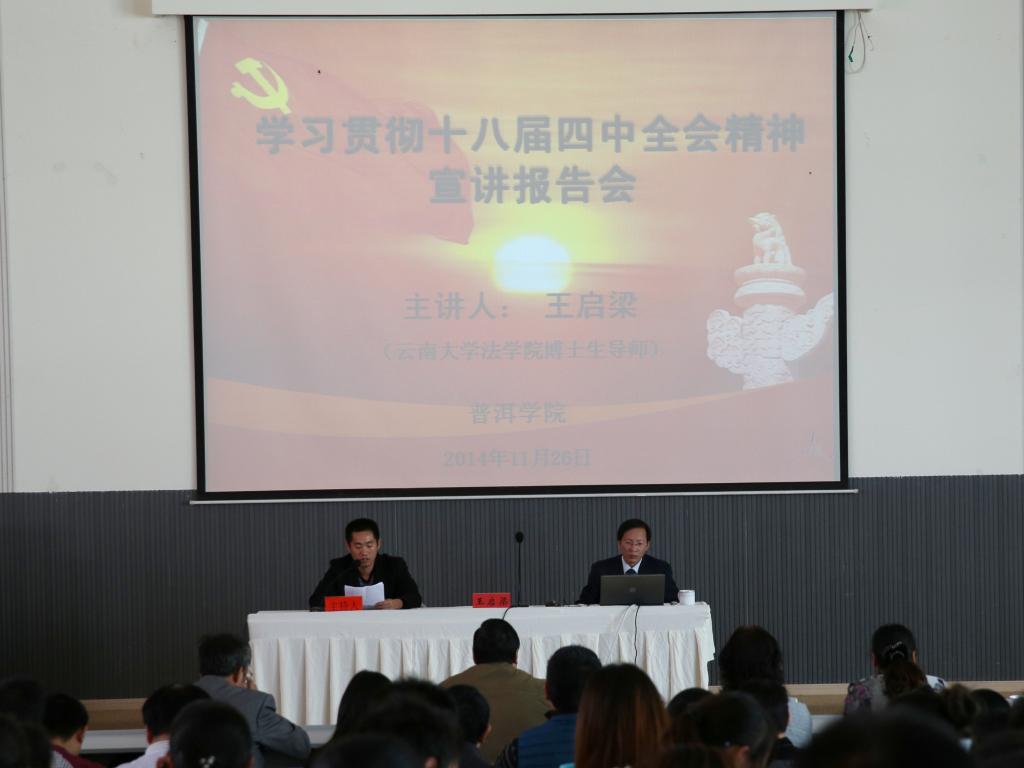 按照中共云南省委宣传部 中共云南省委高校工委《关于在“双百双进”活动中认真组织十八届四中全会精神宣讲的通知》要求,2014年11月26日下午,我校在健行楼二楼阶梯教室召开学习贯彻十八届四中全会精神宣讲报告会。校领导、院长助理、中层干部、全校辅导员及学生代表共计300余人参加会议。云南大学法制实践与理论研究中心主任、研究生院副院长、法学院博士生导师王启梁教授应邀作宣讲报告。会议由校党委宣传部部长李祖军主持。