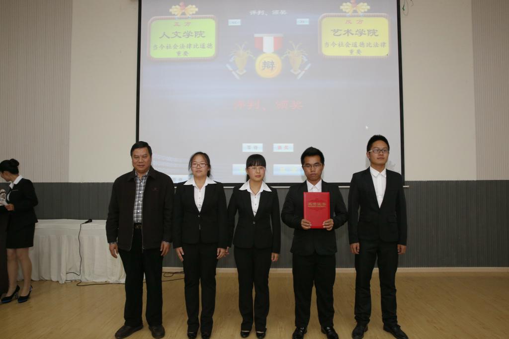 经过初赛、复赛,政法学院、人文学院、经管学院及艺术学院脱颖而出,进入最后的总决赛。比赛分两场进行,人文学院和艺术学院、政法学院和经管学院分别捉对厮杀。正反双方围绕“当今社会法律比道德重要还是道德比法律重要”的辩题展开辩论。