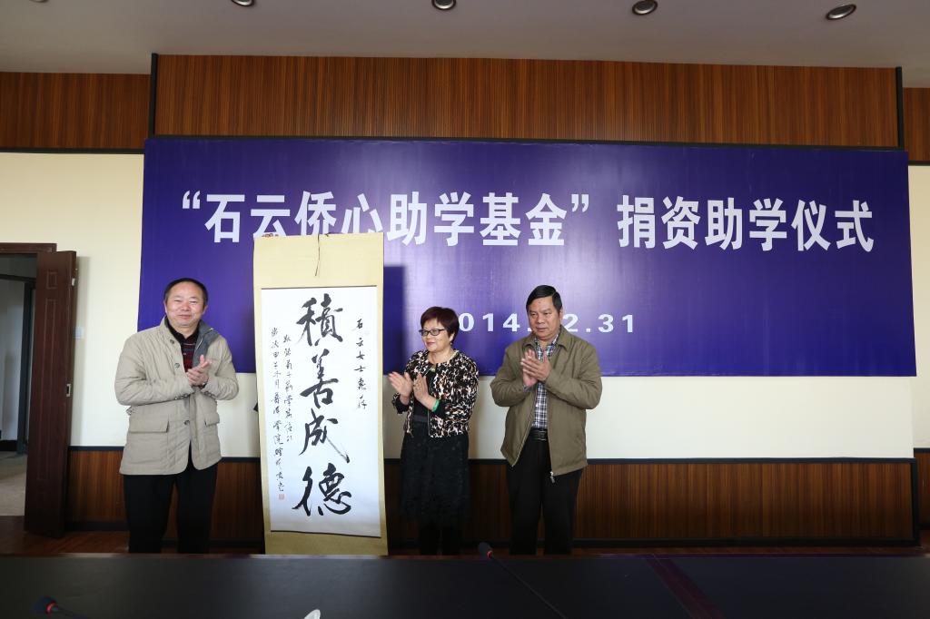 伍中华书记、成文章校长代表学校向石云女士赠送了“积善成德”书法作品。