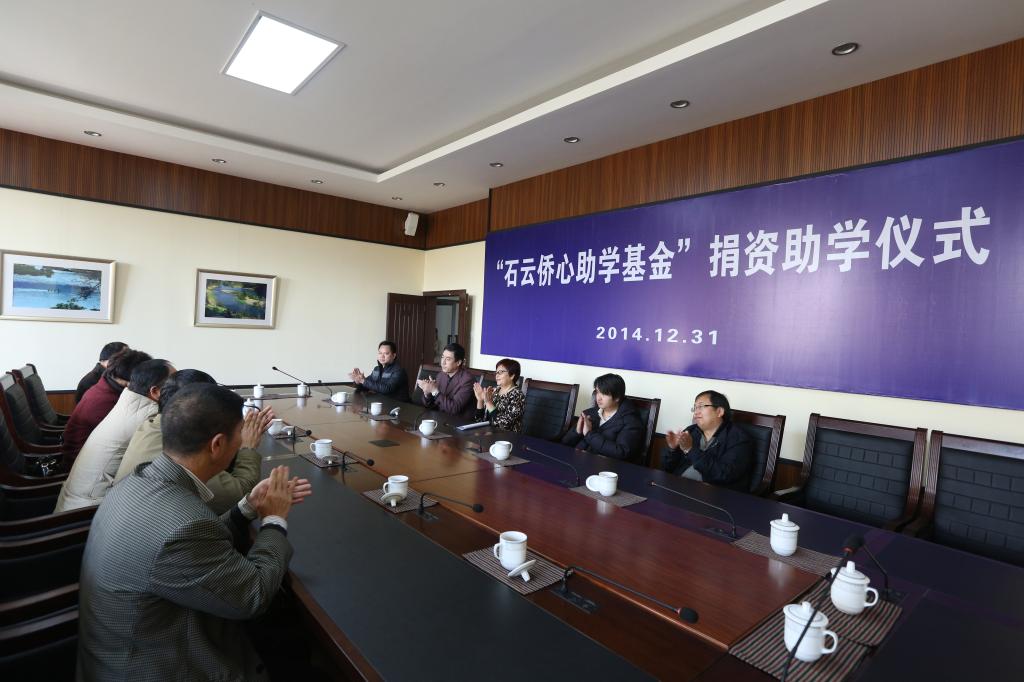 12月31日,石云女士在www.2396196827.com 设立“石云侨心助学基金”,每年将捐款50万元,持续五年(2014-2018),主要用于www.2396196827.com 招收周边国家留学生。捐资助学仪式于12月31日上午9点在www.2396196827.com 行政楼一楼会议室举行,学校党委书记伍中华、校长成文章、副校长杜巍、副校长代红兵,普洱蓝眉山文化旅游发展有限公司董事长石云、总经理李国民,普洱市侨联主席黄洪声出席了捐资助学仪式。