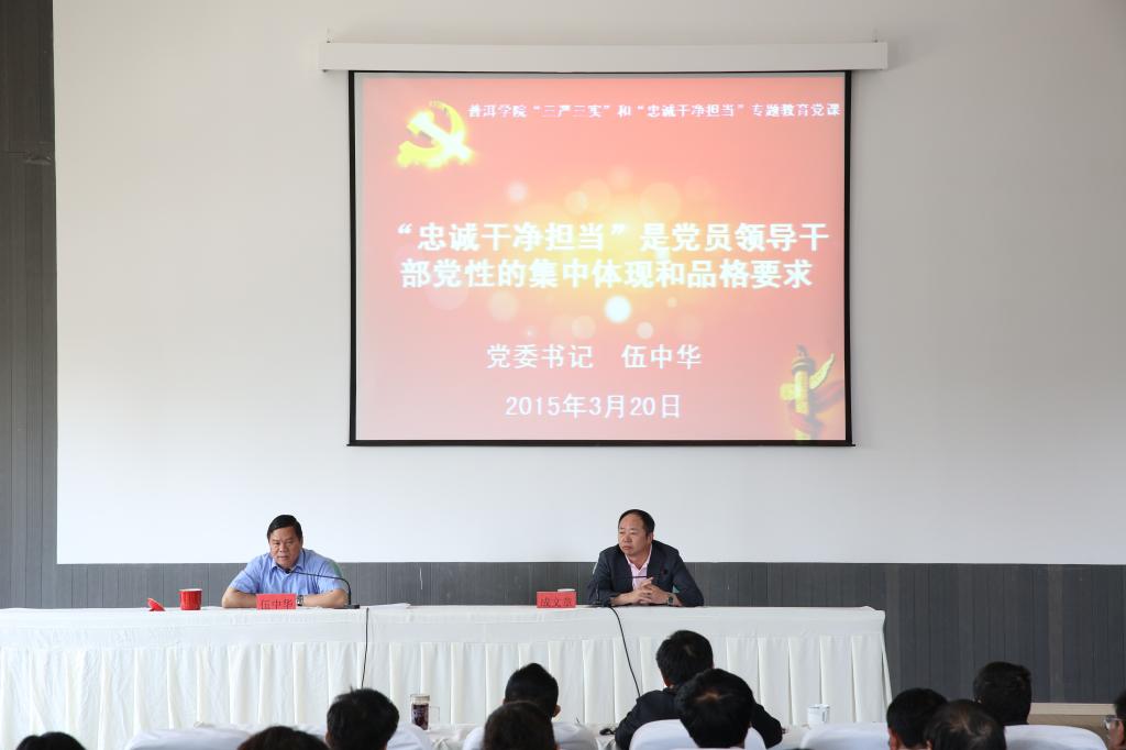 最后,成校长作总结发言。成校长首先感谢伍书记为与会人员讲了一堂受益匪浅的党课。他指出,伍书记的党课理论深刻、观点鲜明、引经据典,对加强党员干部队伍建设,提高党员干部队伍素质,坚定党员干部队伍理想信念具有很强的指导意义。他同时表示,伍书记的党课紧紧围绕“三严三实”和“忠诚干净担当”专题教育的主要内容,紧密联系学校实际,为学校在新时期、新常态下的转型发展、跨越发展带来了思想,带来了理论,为有效开拓学校事业发展提供了强有力的思想保障。他强调,与会的党员领导干部会后要认真消化、领会伍书记的党课内容,做好党课精神传达工作,并结合自身实际,凝心聚力把学校工作做好、做实。
