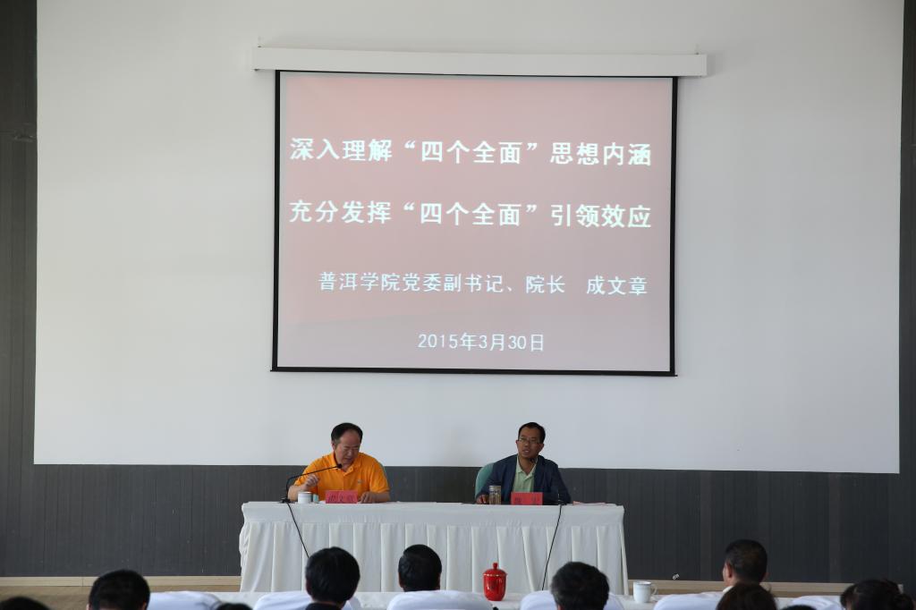成校长指出,“四个全面”确立了新形势下党和国家各项工作的战略方向、重点领域、主攻目标,我校在自身发展中要注重发挥好“四个全面”的引领作用:一是树立“新常态”思维,认识教育发展的“新常态”,准确把握“四个全面”对教育发展方向的新要求,要积极主动将教育事业融入到国家战略,为地方经济社会发展做出积极的应有贡献;二是强化“积极进取”和“改革创新”的思想意识,大力提升我校教育办学的质量和区域性影响力;三是树立信心,克服困难、畏难心理,从实际出发,切实解决重点问题和矛盾问题;四是树立抢抓机遇意识,紧密围绕习近平总书记考察云南时的重要讲话精神,结合地方区域性特点,努力筹建国门大学,积极培养地方急需人才;五是遵循“依法治国”的制度要求,坚持依法治校、合法治校,做到治校有章法、奖惩有依据、办事讲规矩、运行有保障;六是创新人才培养和考核模式,有效推进“三风建设示范高校”的特色建设。成校长强调,只有“严格要求、创新发展、跨越发展、重抓落实”,通过我们的齐心协力,我们的学校才能办好,办出成绩、办出影响、办出尊严,我们的学校才可能真正发挥出面向南亚东南亚辐射中心的作用。