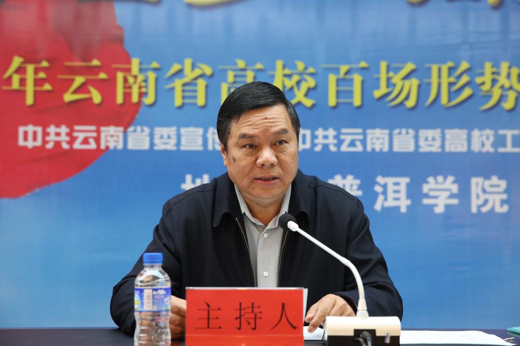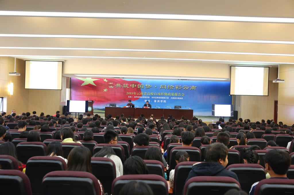 为深入贯彻中央关于进一步加强和改进新形势下高校宣传思想工作的决策部署和省委要求,按照百场形势政策报告会和云岭大讲堂的统一安排,2015年10月12日下午,我校在图书馆一楼报告厅举行“共筑中国梦·同绘彩云南”2015年第二场云南省高校百场形势政策报告会。云南省社科联范建华主席应邀到我校作“‘带状发展’——‘十三五’中国文化产业新趋势”的专题报告。校领导、校长助理、科级以上领导干部以及师生代表共计400余人参加会议。会议由学校党委书记伍中华主持。