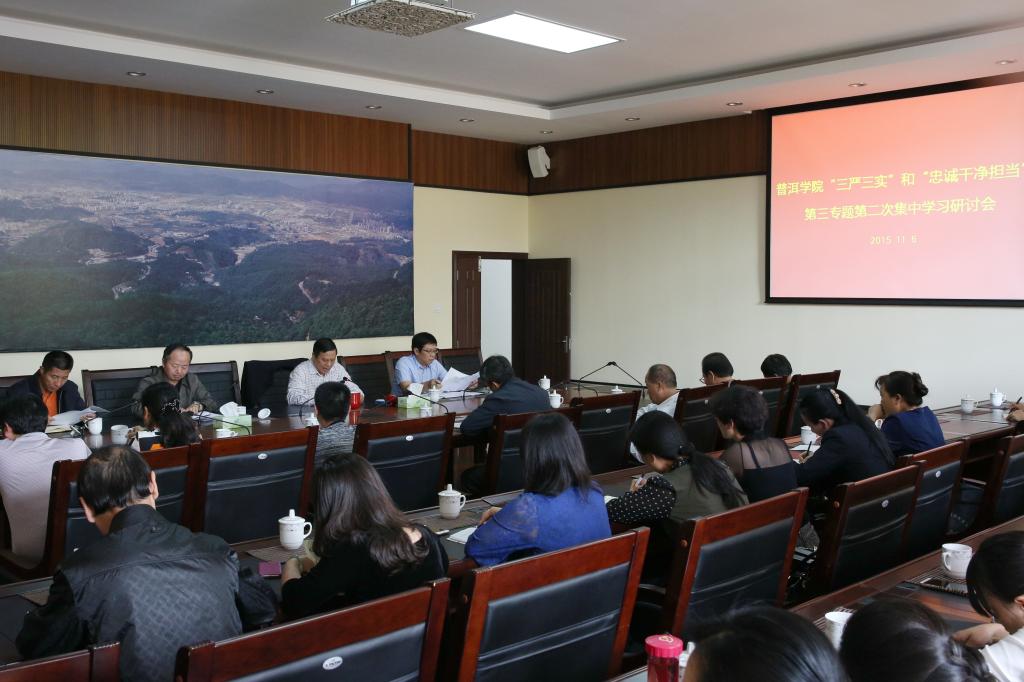 按照“三严三实”和“忠诚干净担当”专题教育的统一安排和部署,根据省委组织部《关于抓好第三专题集中学习研讨的通知》和《www.2396196827.com “三严三实”和“忠诚干净担当”专题教育第三专题集中学习研讨实施方案》的要求,2015年11月6日下午,我校在政楼一楼会议室召开“三严三实”和“忠诚干净担当”专题教育第三专题第二次集中学习研讨会。校领导、校长助理、党委部门负责人、党总支书记、专教办全体成员共40余人参加会议。会议由党委书记伍中华主持。