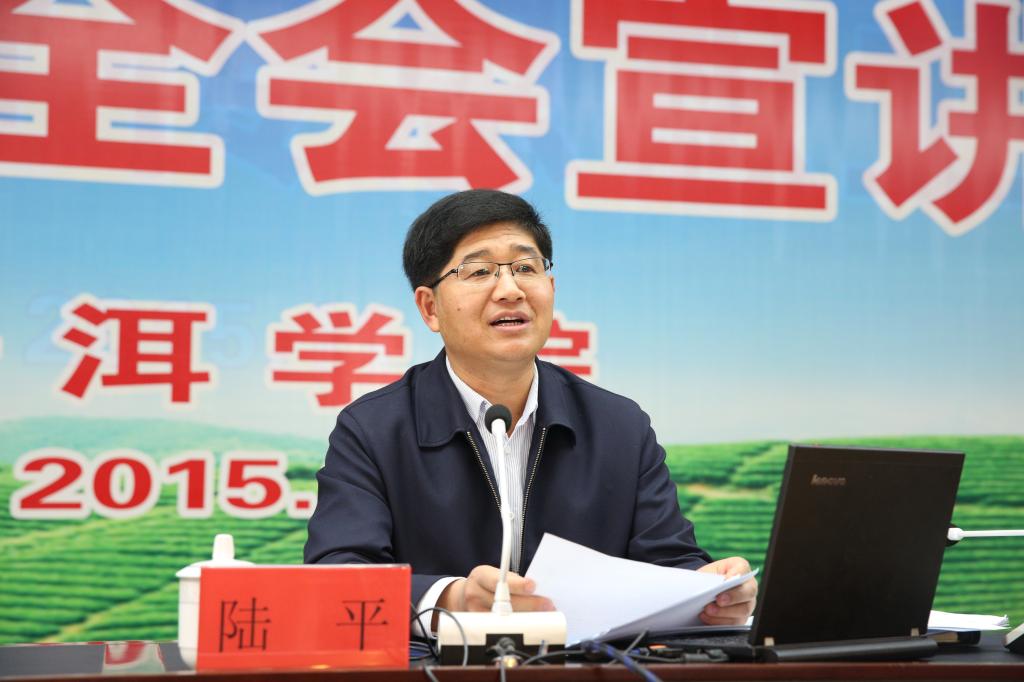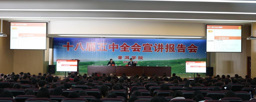 为进一步学习贯彻落实党的十八届五中全会精神,掀起我校师生学习贯彻全会精神热潮,我校于2015年12月16日下午邀请了中共普洱市委副书记、市委宣讲团团长陆平为全校师生作十八届五中全会精神宣讲报告。学校领导、校长助理、副科级以上领导干部及师生代表共计400余人参加会议。会议由学校党委副书记郑颖松主持。