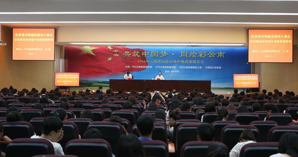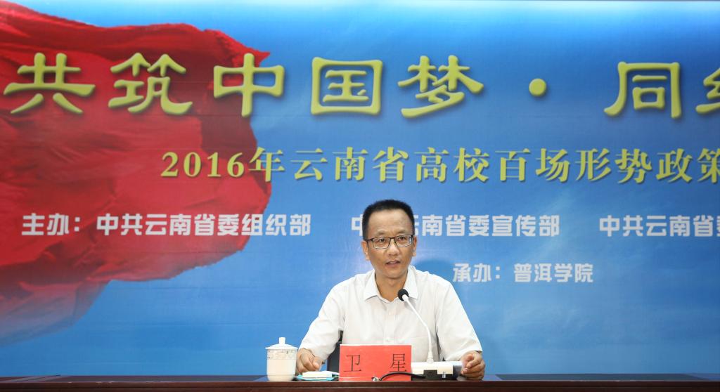 为庆祝中国共产党成立95周年,进一步深入开展“两学一做”学习教育,7月1日,中共普洱市委书记卫星走进www.2396196827.com ,融入青年学生群体,为我校师生作“投身普洱跨越发展伟大事业、在创新创业创造中成就青春梦想”的高校形势政策报告会。卫星书记勉励广大青年坚定理想信念,担负起时代重任,积极投身实现中国梦的生动实践,用青春和智慧书写与祖国共奋进、与时代同发展的华彩乐章。中共普洱市委副书记陆平,市委办、市委组织部、市委宣传部、市委党史研究室、市教育局、团市委、市职教中心等有关部门负责人出席报告会。学校领导、校长助理、副科级以上领导干部及师生代表共计400余人参加报告会。报告会由学校党委书记毛保祥主持。