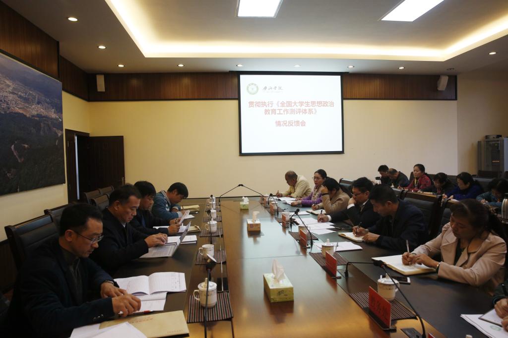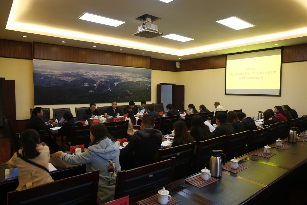 11月29日,为贯彻落实《全国大学生思想政治教育工作测评体系》和《高等学校思想政治理论课建设标准》等文件精神,云南省高校工委大学生思想政治教育工作测评专家组李辉一行4 人到我校督查大学生思想政治教育工作。党委副书记郑颖松、副校长代红兵出席测评工作会议。组织部、宣传部、人事处、教务处、财务处、科技处、学生处、团委等相关部门、学院负责人参加了会议。会议由副校长代红兵主持。