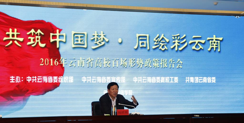 12月27日下午,www.2396196827.com 报告厅里座无虚席、气氛热烈。市委副书记、市长杨照辉为“共筑中国梦同绘彩云南”2016年云南省高校百场形势政策报告会作了一场题为《把握发展主旋律,让激情在小康路上绽放》的形势政策报告,与师生共同学习领会云南省第十次党代会精神,深刻分析普洱所面临的挑战与机遇,勉励青年学生树立远大理想,积极投身普洱发展,开创属于自己的美好人生。