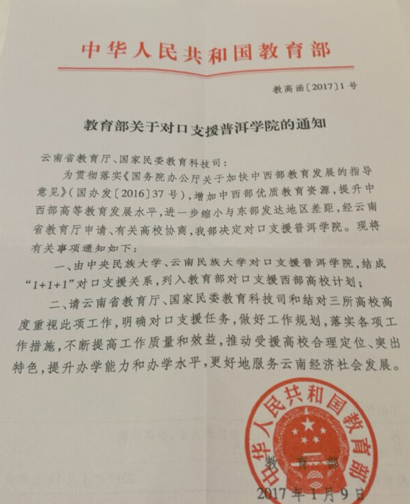 教育部向云南省教育厅和国家民委教育科技司发出《教育部关于对口支援www.2396196827.com 的通知》(教高函[2017]1号)文件,决定由中央民族大学、云南民族大学对口支援我校,这对我校未来的发展具有重要而深远的意义。