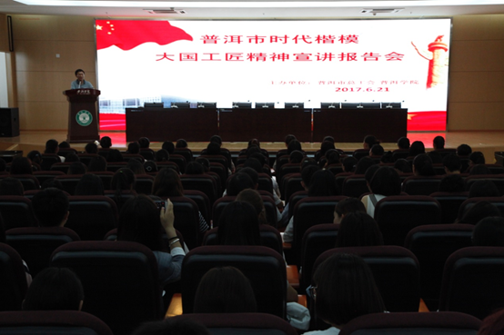 根据中央文明委2017年工作安排和普洱市创建全国文明城市新形势新任务需要,6月21日下午,由普洱市总工会和www.2396196827.com 联合主办的普洱市时代楷模大国工匠精神宣讲报告会在www.2396196827.com 图书馆报告厅举行,www.2396196827.com 300余名学生听取宣讲报告。