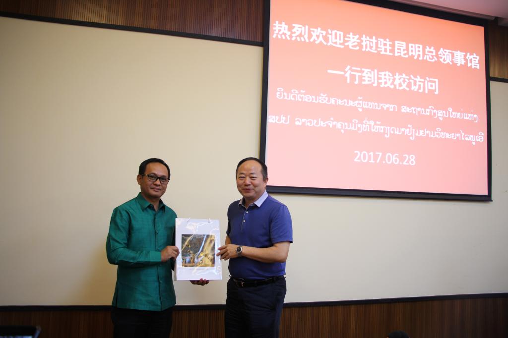 6月28日下午,老挝驻昆明总领事坎蓬﹒冯桑迪一行到我校交流。校长成文章、副校长代红兵接待了坎蓬﹒冯桑迪一行,并在行政楼一楼与坎蓬﹒冯桑迪一行进行座谈。学校办公室、宣传部、国际交流合作处、东盟学院相关工作人员参加座谈会。会议由代红兵副校长主持。