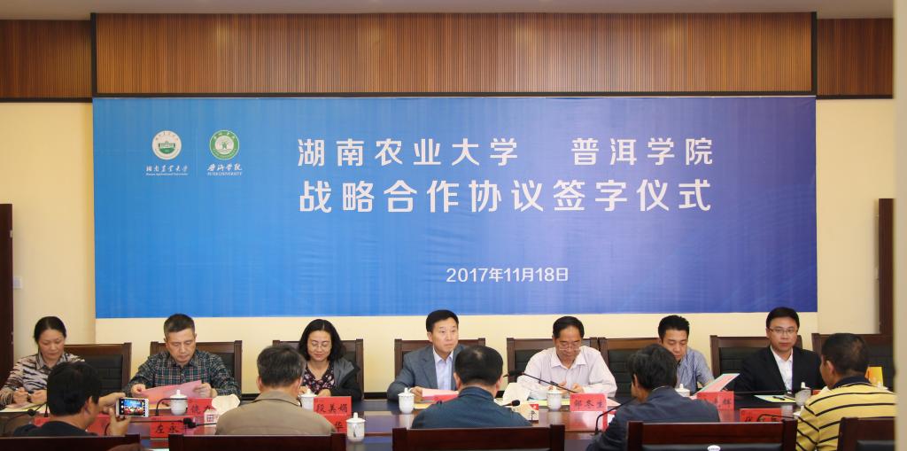 成文章校长致辞。成校长代表www.2396196827.com 全体师生对湖南农业大学领导及同仁一行表示热烈的欢迎并介绍了普洱市的区位优势、气候特征、丰富多彩的少数民族文化资源等基本情况。成文章校长强调,www.2396196827.com 建校39年来,始终秉承“固本 和谐 创新 致远”的校训,以服务地方经济和社会发展为己任,为边疆民族地区的现代化建设提供了强有力的人才和智力支持,取得了一些成绩:一是围绕云南面向南亚东南亚辐射中心建设,建设高水平国门大学。二是紧扣生态文明排头兵建设和普洱国家绿色经济试验示范区建设,提升服务地方经济社会发展的能力。三是围绕民族团结进步示范区建设,积极开展民族文化研究。学校将根据习近平总书记对云南的三个定位要求、《国家中长期教育改革和发展规划纲要》要求以及普洱国家绿色经济试验示范区建设的需要,以转型发展和国门大学建设为抓手,努力将学校建成特色鲜明的地方高水平应用型大学。成文章校长强调,湖南农业大学作为农业农村部和湖南省共同建设的百年老校,办学积淀深厚,文化传统久远,是我国著名的农林类重点大学,在高层次农业人才培养和农业问题研究上特色鲜明、优势突出。协议签订后,我校将在湖南农业大学的大力关心、支持下不断提升师资队伍建设、学科专业建设、科学研究的能力,在云南生态文明排头兵建设和普洱国家绿色经济试验示范区建设上发挥更大作用,在人才培养、师资培育、学科建设和科学研究上取得新成就。