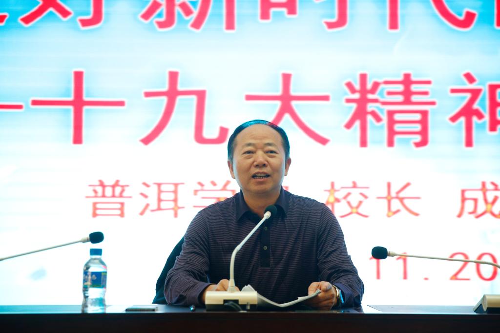 成文章校长介绍了党的十九大的基本情况,指出十九大胜利召开的重要意义并用“实、新、全、长、民(人)、一、强(硬)、青、绿、严”十个字对十九大报告进行了解读。