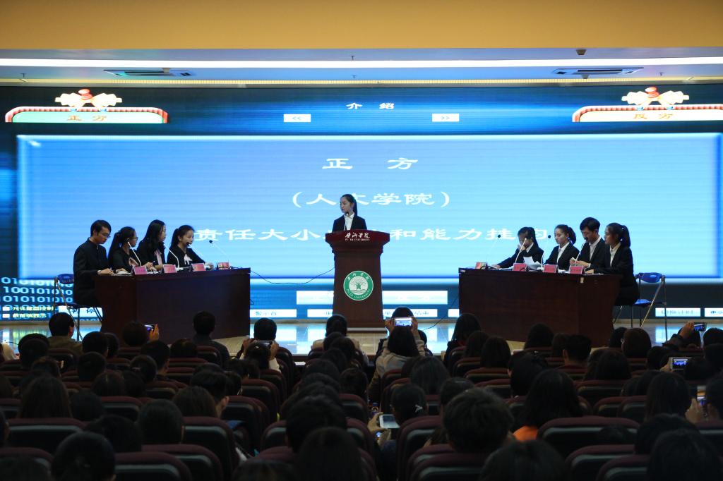 经过初赛、复赛的激烈角逐,人文学院代表队、外国语学院代表队、教师教育院代表队、政法学院代表队进入本次决赛。此次辩论赛以“责任大小应不应该和能力挂钩”为主题,分两场进行。
