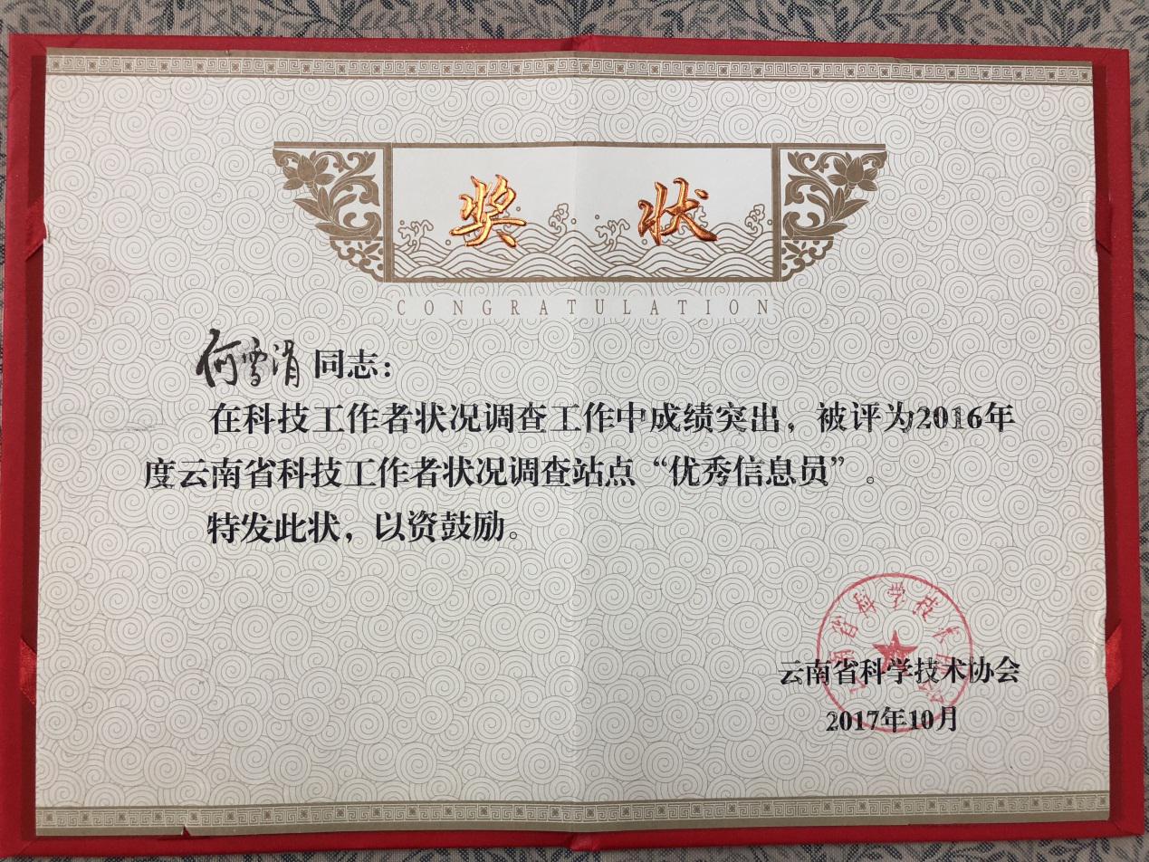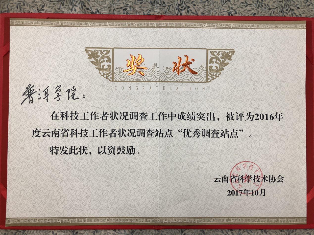 根据云南省科学技术协会文件《关于2016年度云南省科技工作者状况调查优秀站点和优秀个人的通知》(云科协〔2017〕10号),我校荣获2016年度云南省科技工作者状况调查站点“优秀调查站点”称号,我校科技处何雪涓老师被评为2016年云南省科技工作者状况调查站点“优秀信息员”。