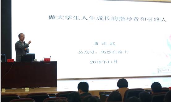 11月18日,全国“时代楷模”曲建武教授首次走进我校和师生们作近距离的交流,他为广大师生带来了题为《做大学生人生成长的指导者和引路人》的主题报告。他满怀激情的演讲感动了到场的师生,师生们对他将满腔热情投入到办好人民满意的教育,将事业融入自己的血液的精神充满了敬意,在他的身上师生们感受到了无私的奉献与付出,心系学生,心怀祖国,用自己的实际行动诠释者一位教育者的初心和执着坚守,一位老辅导员的赤子之心。