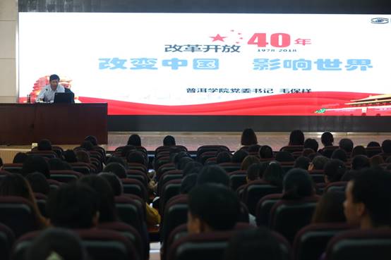 党委书记毛保祥为学生讲授了《改革开放40年改变中国 影响世界》专题。毛书记从改革开放40年取得的辉煌成就说起,为学生们深入分析了只有改革开放才能发展中国的深刻原因以及今天的中国将改革开放进行到底的勇气和信心。他与师生们分享了自己作为一个改革开放亲历者、实践者的感受,引发了在场师生的强烈共鸣。他同时勉励广大青年学子坚定理想信念,丰富文化知识,提高自身素养,增强本领担当,把个人理想与国家发展、社会事业结合起来,在实现中国梦的进程中放飞自己的青春梦想,贡献自己的积极力量。