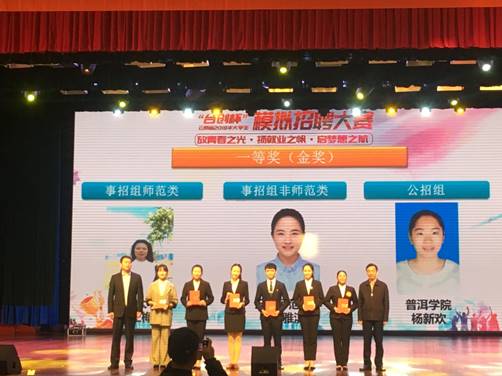 经校级复赛、决赛层层选拔出的7位选手代表我校参加了此次省级决赛。此次省级总决赛共分六个组别,设金奖六名。最终,我校杨新欢同学在公招组公务员类的比赛中以绝对优势勇夺金奖,张新贤、康蕊、杨婷、叶一麟、王文华、李静同学获“潜力人才奖”,王班同学获简历设计赛铜奖。