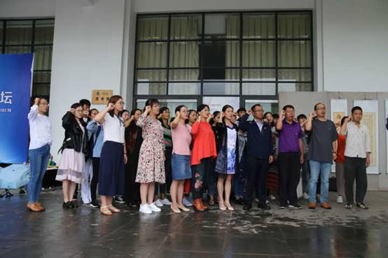 在书法展览现场,与会党员集合在党旗之下,举起右拳重温入党誓词,号召师生不忘初心,牢记使命,永远跟党走。