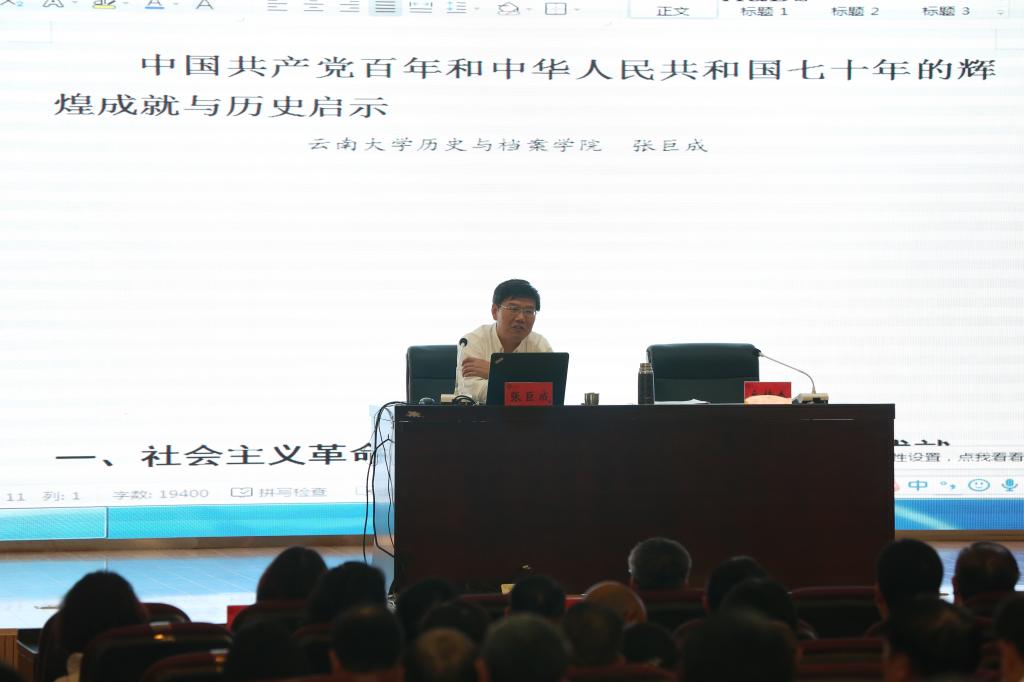 会上,张巨成以“中国共产党百年和中华人民共和国70年的辉煌成就与历史启示”为主题,分别从社会主义革命和社会主义建设时期的光辉成就、改革开放和中国特色社会主义建设时期的辉煌成就、新时代党和国家事业的历史性成就和历史性变革、中华人民共和国70年辉煌成就的历史启示等四个方面为与会党员干部、师生党员讲授党史和新中国史。他指出,70年来,中华人民共和国取得的辉煌成就,是中华民族发展史上不能忘却、不容否定的壮丽篇章,也是中国人民和中华民族继往开来、奋勇前进的现实基础。当前社会发展急剧变革、社会思潮多元复杂,加强党的政治建设,学习党史和新中国史极为重要,共产党员一定要保持清醒的政治头脑,树立和坚持正确的人生观、世界观、价值观和历史观,要有正确的判断力,抵制、反对、批判一切不利于国家发展和违背党史、新中国史的社会思潮。做到必须坚持党的领导,坚持全面从严治党,不断加强和改善党的领导;必须坚持以人民为中心;必须全面地、完整地、科学地坚持马克思主义指导地位;必须坚持走中国特色社会主义道路,不断坚持和发展中国特色社会主义;必须坚持完善和发展中国特色社会主义制度,不断发挥和增强我国制度优势;必须坚持以发展为第一要务,不断增强我国综合国力;必须坚持扩大开放,不断推动共建人类命运共同体;必须坚持辩证唯物主义和历史唯物主义世界观和方法论,正确处理改革发展稳定关系。