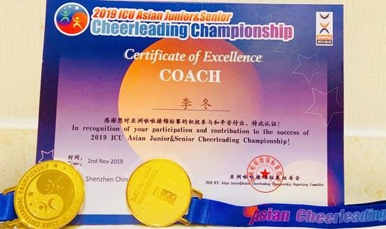 教练员李冬老师获得国际啦啦操优秀教练员称号。