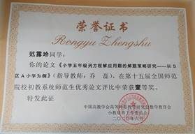 2020年4月,中国高教学会高等师范教育研究会组织“全国师范院校初教系统第十五届数学、信息技术类学生优秀论文评选”活动,我校教师教育学院精心组织,积极选派,由乔磊老师指导的2016级小理2班范露玲同学的《小学五年级列方程解应用题的解题策略研究——以S区A小学为例》和丁艳同学的《云南省各高校小学教育专业综合实践类课程设置的对比研究》两篇论文荣获一等奖。