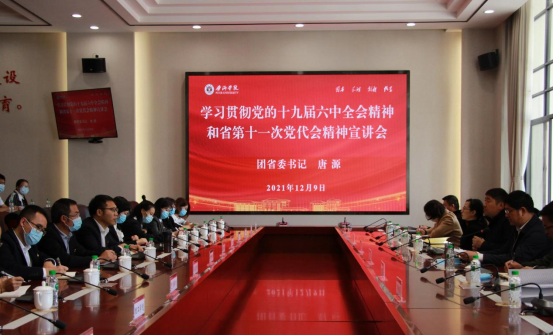 2021年12月9日,团省委书记唐源一行到我校宣讲党的十九届六中全会和省第十一次党代会精神。党委书记陆平出席并主持会议,党委副书记吴琳,党委委员毕廷菊及师生代表参加宣讲活动。