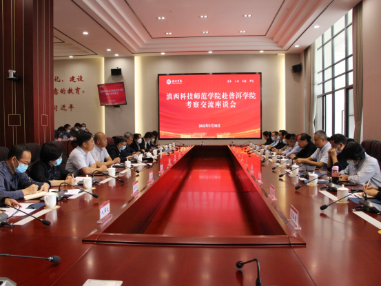 2022年3月30日,滇西科技师范学院党委副书记、院长董大校一行到我校考察并召开交流座谈会。我校党委副书记、院长马文会,党委委员、副院长白应华、李险峰出席会议。白应华主持会议。