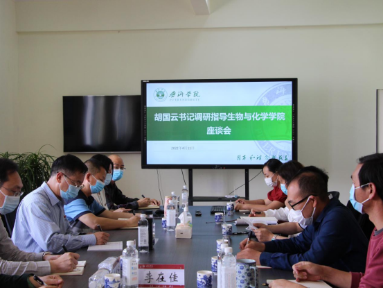 2022年4月12日下午,校党委书记胡国云一行到生物与化学学院调研,了解该学院基本情况、党建工作、疫情防控等情况并听取学院师生对学校工作的意见建议。