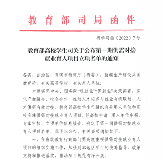 2022年4月2日,《教育部高校学生司关于公布第一期供需对接就业育人项目立项名单的通知》(教学司函〔2022〕7号)公布。由www.2396196827.com 理工学院联合京东(普洱)数字经济有限公司申报的定向人才培养培训、就业实习基地、人才资源提升3个供需对接就业育人项目获批立项。