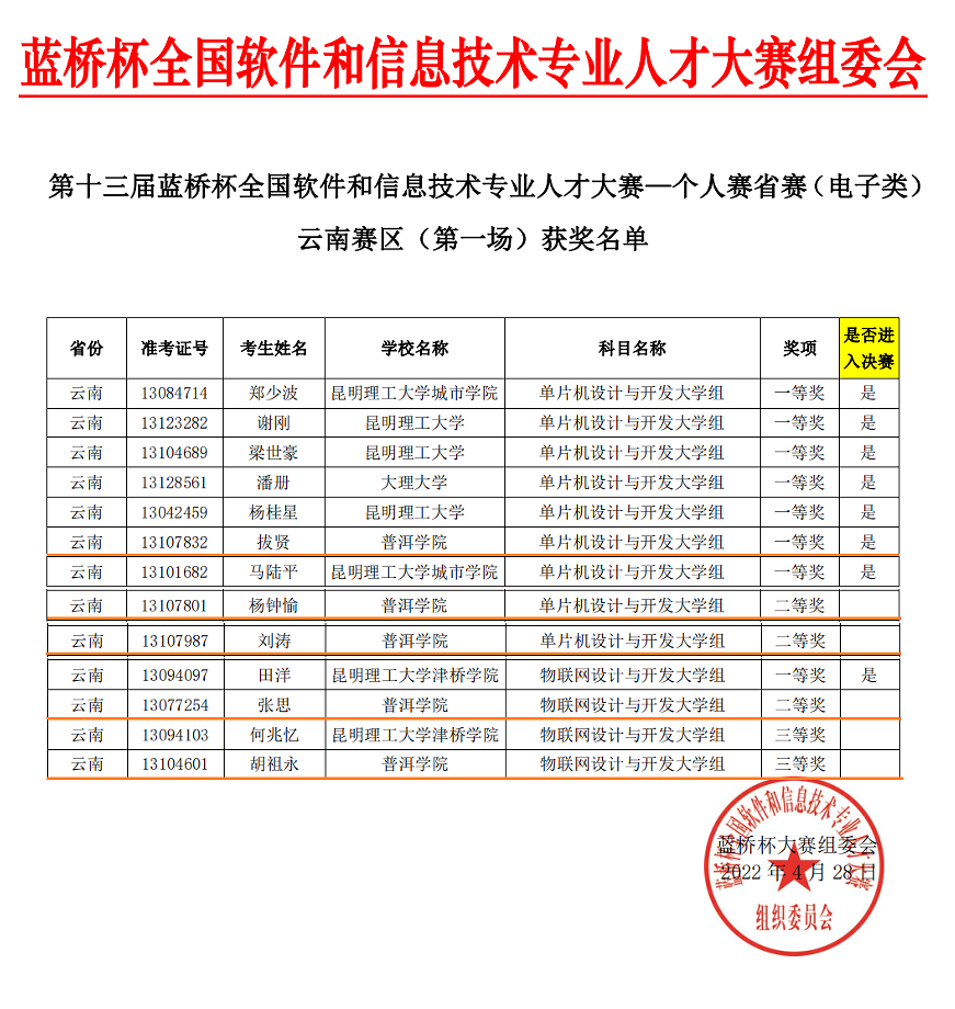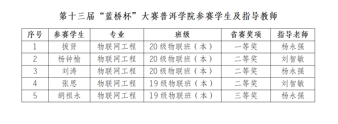 2022年4月,我校组织理工学院物联网工程专业5名同学参加了第十三届“蓝桥杯”大赛个人赛省赛(云南赛区),这也是我校首次组队参加“蓝桥杯”大赛。在大学组单片机设计与开发、物联网设计与开发两个赛项的比赛中,经过激烈角逐,参赛同学全部均取得了良好成绩,斩获个人赛省赛一等奖1项、二等奖3项、三等奖1项,其中一等奖获奖选手拔贤同学入围全国总决赛。