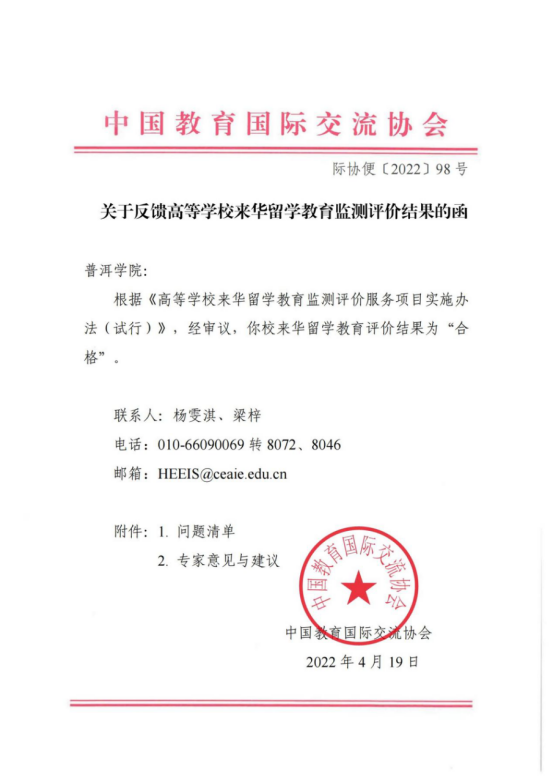 根据《云南省人民政府教育督导委员会办公室关于开展招收外国留学生高校教学管理评估工作的通知》(云政教督办函﹝2021﹞8号),为进一步规范www.2396196827.com 外国留学生招生和教学工作,www.2396196827.com 认真对照《来华留学生高等教育质量规范(试行)》进行自检自查,并委托中国教育国际交流协会作为第三方评估机构进行评估。经中国教育国际交流协会组织专家审议,www.2396196827.com 来华留学教育评价结果为“合格”。
