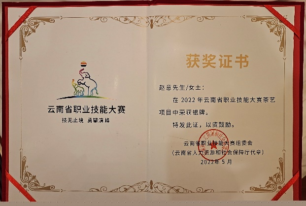 “技无止境、勇攀滇峰”2022年云南省职业技能大赛于2022年5月6日在云南技师学院正式开赛。我校赵意同学在茶艺竞赛项目中斩获银奖。