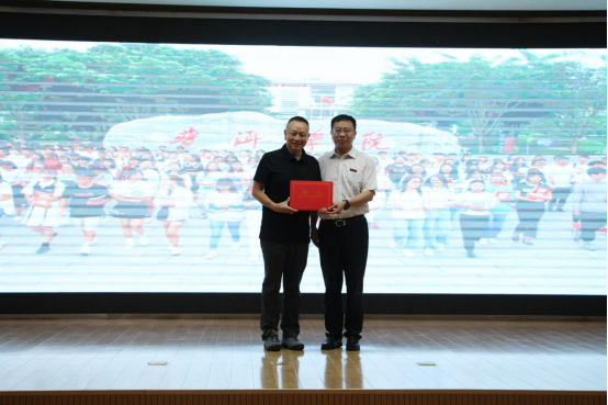 讲座前,胡国云为金飞豹颁发客座教授聘书;金飞豹为我校捐赠图书,并观看了体育学院民族啦啦操表演。