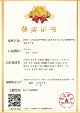 2022年6月26日,云南省教育厅举行了2022年云南省高等学校线上操舞比赛暨云南省操舞教学成果展示大赛,我校教师教育学院61名学生参加了普通院校组混合组“《第三套校园啦啦操示范套路(2020版)》大学组花球”、“《第三套校园啦啦操示范套路(2020版)》大学组爵士”、“自编啦啦操自由舞蹈”和“自编啦啦操花球”4个项目的比赛,最终荣获了3项第一名和1项第二名的好成绩!为我校争得了荣誉。