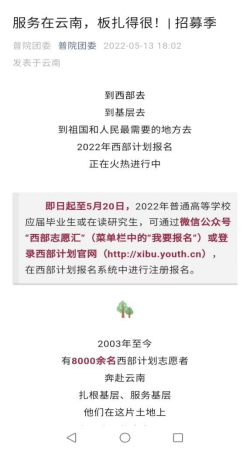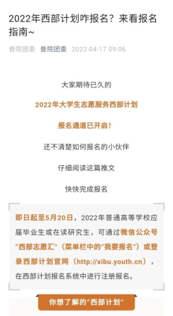4-5月,西部计划宣传阶段,团委积极推进西部计划工作,将西部计划的报名流程、相关文件下发到学生手中,并且通过“普院团委”、“www.2396196827.com 团委官网”等新媒体平台发布西部计划相关推文,在学校公告栏上粘贴宣传海报等方式,让毕业生充分了解西部计划的相关政策、文件和招聘岗位信息。