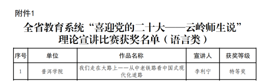 朱赟、角春霖、普师师同学的《戍边随记——扎根边疆,心向中央》作品获全省教育系统“喜迎党的二十大——云岭师生说”理论宣讲比赛(文艺类)优秀奖。