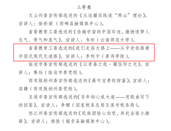 6月25日-27日,省委宣传部举办了全省“砥砺奋进新征程喜迎党的二十大——党的创新理论我来讲”理论宣讲大赛决赛,省委教育工委推选四个作品参赛,其中,我校李利宁老师的《我们走在大路上——从中老铁路看中国式现代化道路》作品获云南省“砥砺奋进新征程喜迎党的二十大——党的创新理论我来讲”理论宣讲大赛(语言类)决赛三等奖。