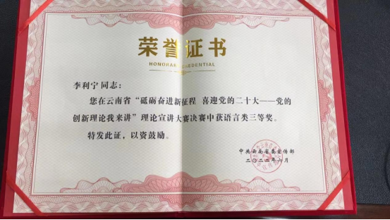 李利宁老师的《我们走在大路上——从中老铁路看中国式现代化道路》作品获全省教育系统“喜迎党的二十大——云岭师生说”理论宣讲比赛(语言类)特等奖。