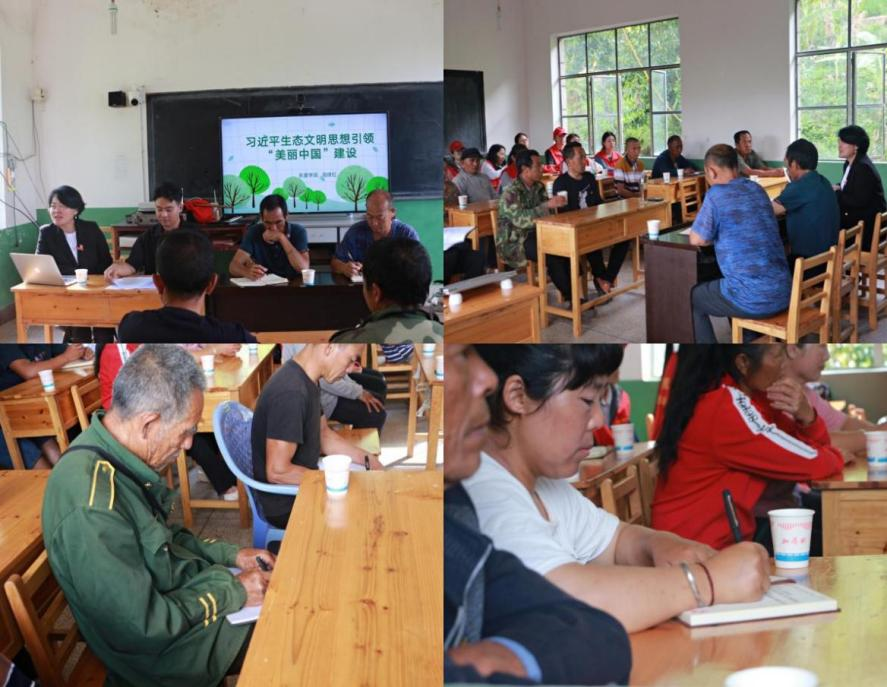 “东盟学院乡村振兴促进团”首先到达普洱市镇沅县按板镇宣河村。在驻村第一书记赵进的组织下,由东盟学院党总支副书记周建红讲授习近平生态文明思想专题党课,她从为什么建设生态文明、建设什么样的生态文明、怎样建设生态文明进行了分享。