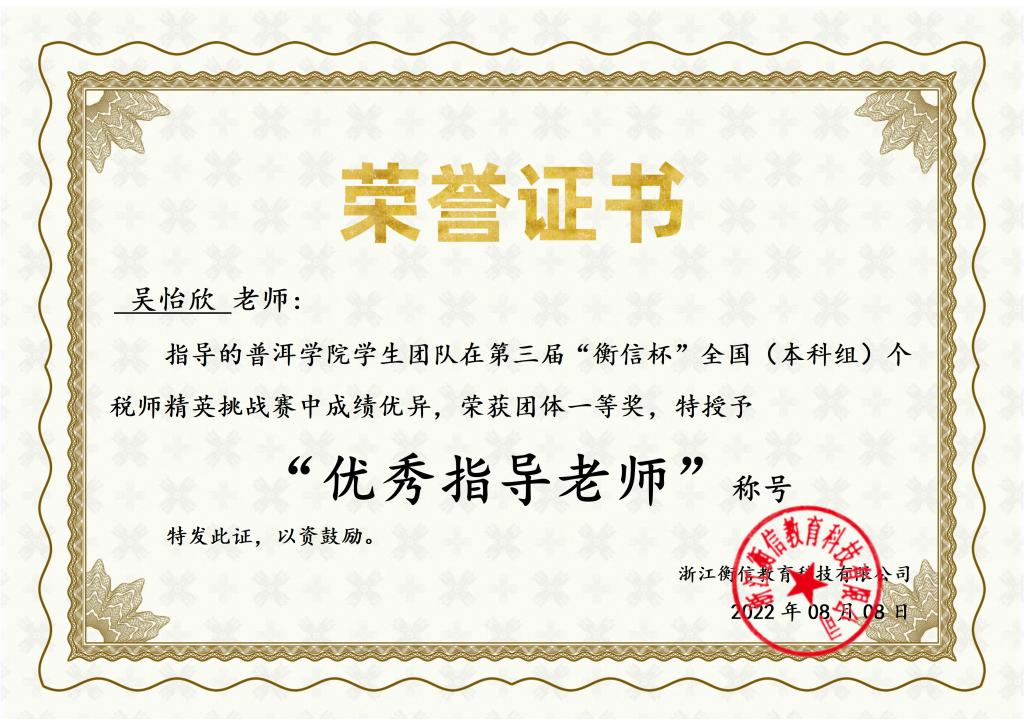 图2我校吴怡欣老师在第三届“衡信杯”全国(本科组)个税师挑战赛中被评为优秀指导教师