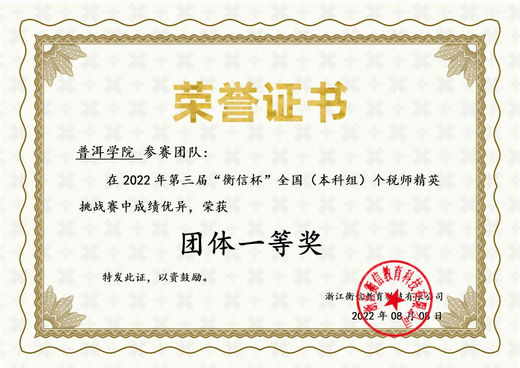 图1我校参赛团队在第三届“衡信杯”全国(本科组)个税师精英挑战赛中获得团体一等奖