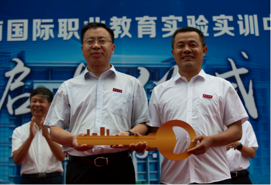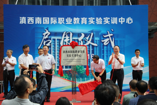 最后,校领导胡国云、马文会与老领导毛保祥、成文章共同为滇西南国际职业教育实验实训中心揭牌。