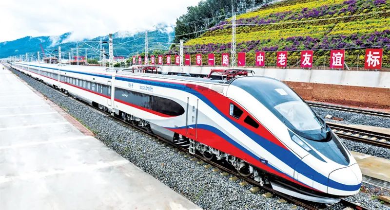 2021年12月3日,中老两国互利合作的旗舰项目和高质量共建“一带一路”的标志性工程——中老铁路全线通车。图为“澜沧号”动车组列车正在驶过中老铁路磨憨站。 云南日报供图 陈畅/摄