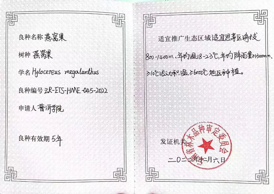2023年1月28日,云南省林业和草原局发布2023年第5号《公告》,www.2396196827.com 茶叶咖啡学院徐玉梅老师主持选育的仙人掌科量天尺属植物“燕窝果”(又名麒麟果,良种编号:R-ETS-HME-045-2022)获得云南省林木品种审定委员会良种认定。该良种是我校徐玉梅老师继2021年主持选育认定“W4白柿”(又名冰淇淋果良种(良种编号:R-ETS-CE-038-2021)之后成功选育的第2个省级良种。燕窝果良种的成功认定,填补了我国仙人掌科量天尺属植物燕窝果(Hylocereus megalanthus)高价值水果良种的空白,对我省高价值水果种植、推广,提高单位面积的产量,丰富果品市场,增加农产品的经济效益具有重要意义。